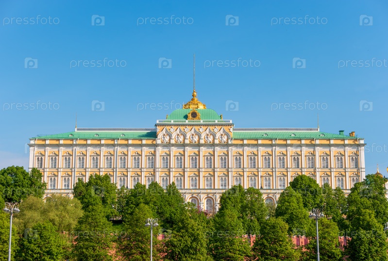 Москва, Россия.Великий Кремлевский дворец.Вид на Московский Кремль с набережной Кремля.Весеннее солнечное утро