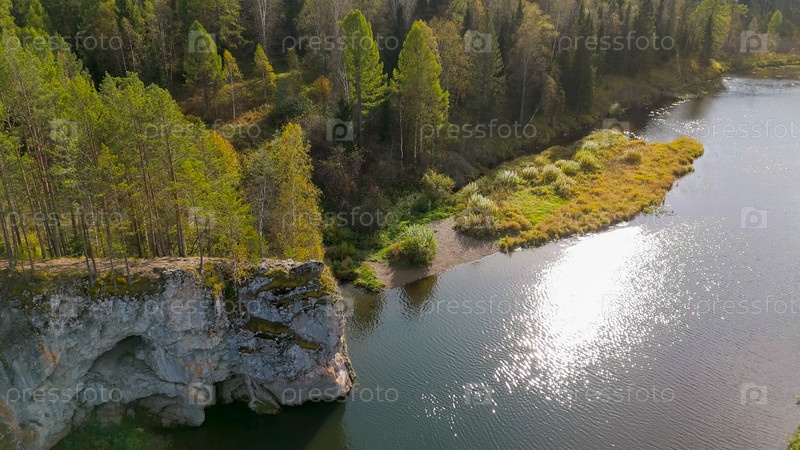 Бажуково, Россия. Фрогстоун. Осенний пейзаж. Река Серга. Рейндерные ручьи - природный парк в лесистой местности, известный своей богатой флорой, вид с воздуха