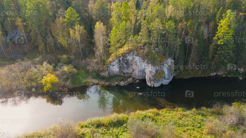 Бажуково, Россия. Каменная дыра или пьяный конь. Осенний пейзаж. Река Серга. Оленьи ручьи. Природный парк в лесистой местности, известной богатой флорой, вид с воздуха