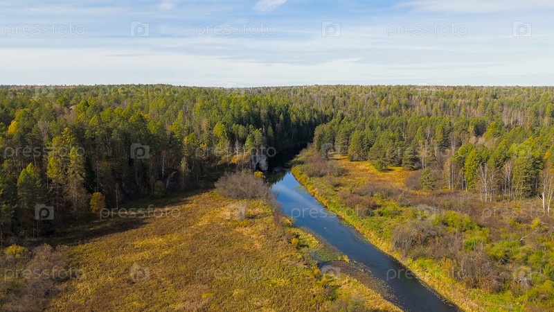 Бажуково, Россия. Каменная дыра или пьяный конь. Осенний пейзаж. Река Серга. Оленьи ручьи. Природный парк в лесистой местности, известной богатой флорой, вид с воздуха