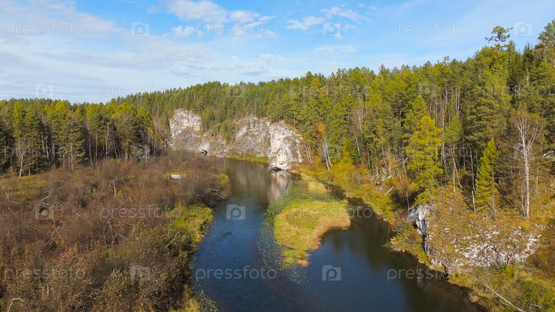 Бажуково, Россия. Скала Писаника. Наскальные рисунки сделаны более 3000 лет назад. Падение. Река Серга. Оленьи ручьи - природный парк в лесистой местности, Aerial View