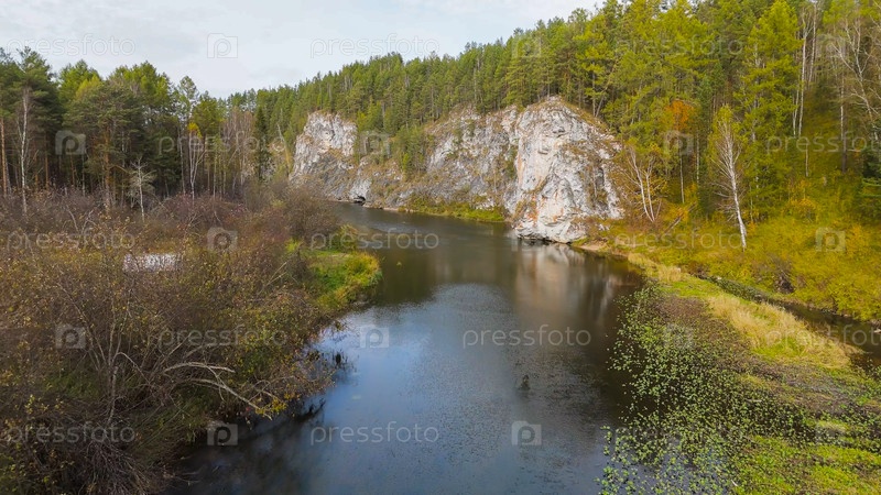 Бажуково, Россия. Осенний ландшафт. Река Серга. Рейндерные ручьи - природный парк в лесистой местности, известный своей богатой флорой, вид с воздуха