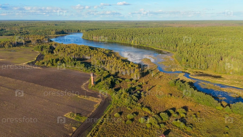 Екатеринбург, Россия. болотистое озеро, река и хвойный лес вдоль берегов. Вечернее время, ранняя осень, Aerial View