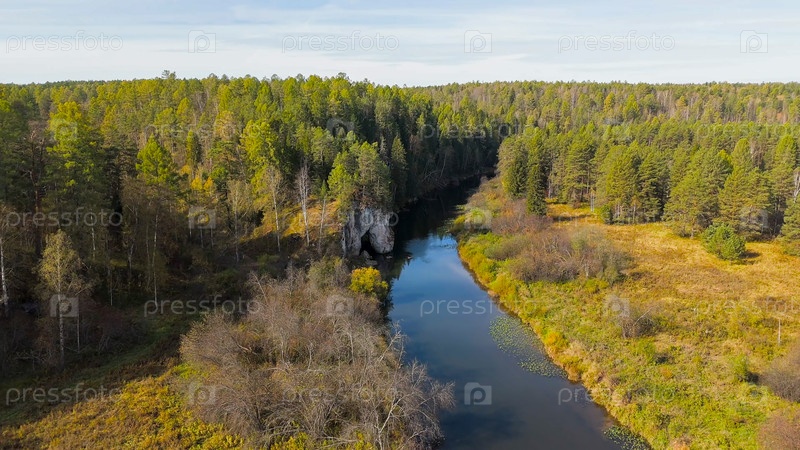 Бажуково, Россия. Каменная дыра или пьяный конь. Осенний пейзаж. Река Серга. Оленьи ручьи. Природный парк в лесистой местности, известной богатой флорой, вид с воздуха
