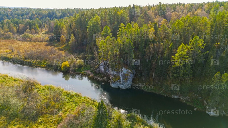 Бажуково, Россия. Каменная дыра или пьяный конь. Осенний пейзаж. Река Серга. Оленьи ручьи. Природный парк в лесистой местности, известной богатой флорой, вид с воздуха