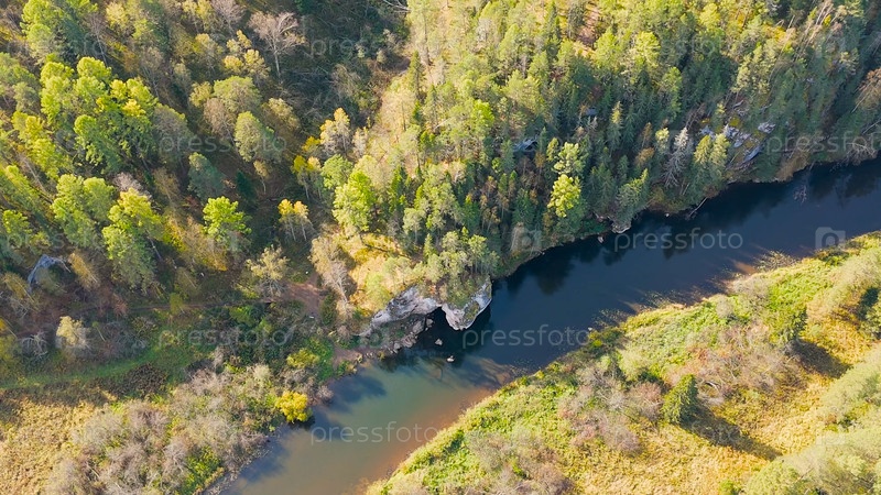Бажуково, Россия. Каменная дыра или пьяный конь. Осенний пейзаж. Река Серга. Оленьи ручьи. Природный парк в лесистой местности, известной богатой флорой, вид с воздуха
