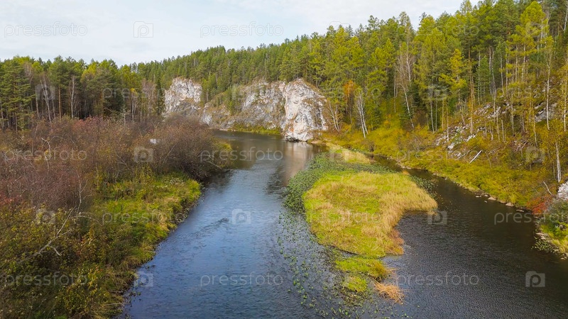 Бажуково, Россия. Осенний ландшафт. Река Серга. Рейндерные ручьи - природный парк в лесистой местности, известный своей богатой флорой, вид с воздуха