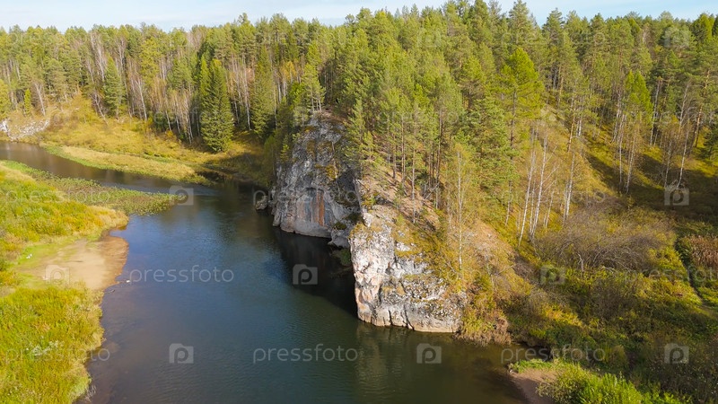 Бажуково, Россия. Фрогстоун. Осенний пейзаж. Река Серга. Рейндерные ручьи - природный парк в лесистой местности, известный своей богатой флорой, вид с воздуха