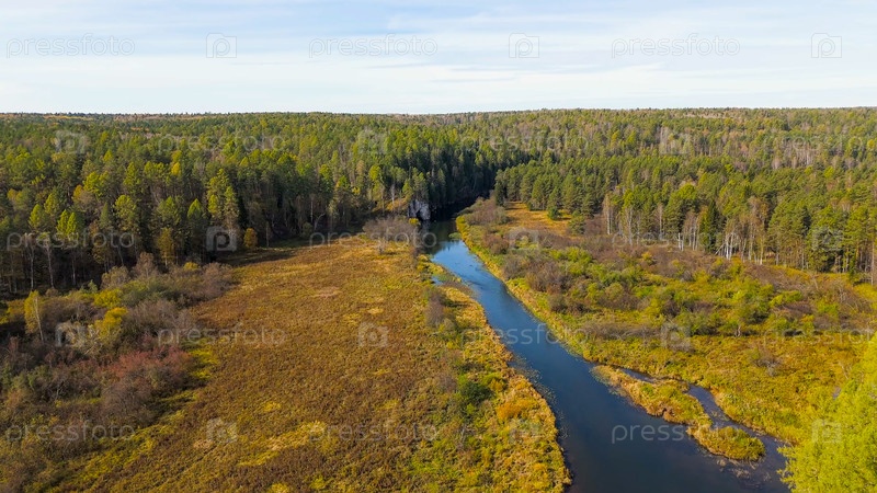 Бажуково, Россия. Каменная дыра или пьяный конь. Осенний пейзаж. Река Серга. Оленьи ручьи. Природный парк в лесистой местности, известной богатой флорой, вид с воздуха