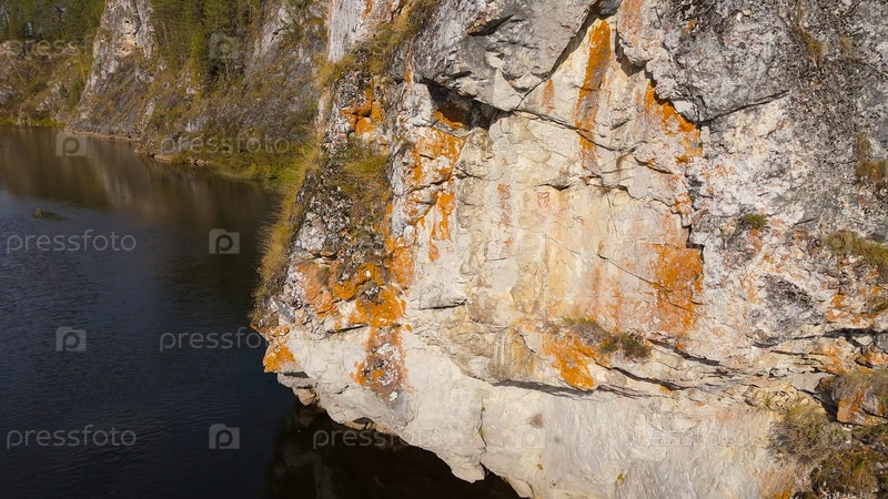 Бажуково, Россия. Скала Писаника. Наскальные рисунки сделаны более 3000 лет назад. Падение. Река Серга. Оленьи ручьи - природный парк в лесистой местности, Aerial View