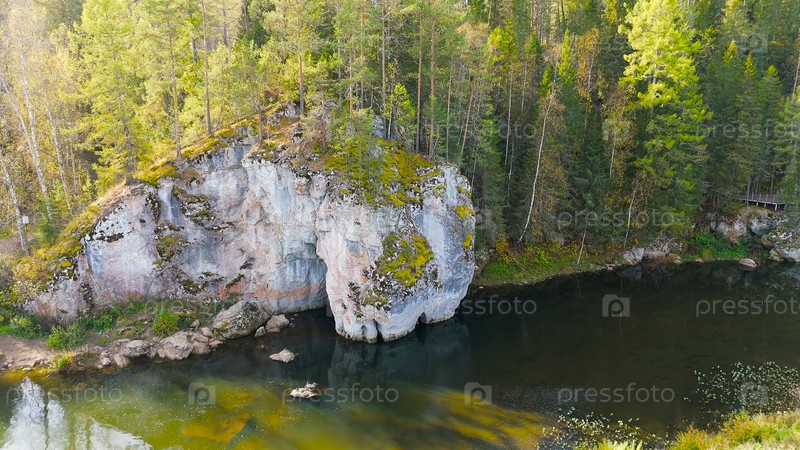 Бажуково, Россия. Каменная дыра или пьяный конь. Осенний пейзаж. Река Серга. Оленьи ручьи. Природный парк в лесистой местности, известной богатой флорой, вид с воздуха