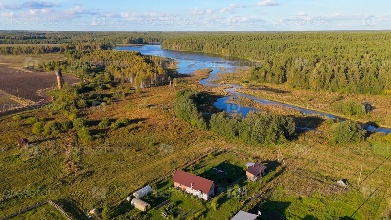 Екатеринбург, Россия. болотистое озеро, река и хвойный лес вдоль берегов. Вечернее время, ранняя осень, Aerial View