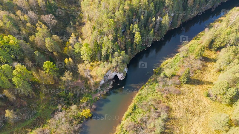 Бажуково, Россия. Каменная дыра или пьяный конь. Осенний пейзаж. Река Серга. Оленьи ручьи. Природный парк в лесистой местности, известной богатой флорой, вид с воздуха