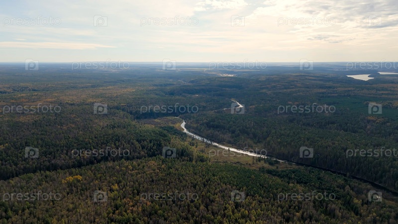 Бажуково, Россия. Осенний ландшафт. Река Серга. Рейндерные ручьи - природный парк в лесистой местности, известный своей богатой флорой, вид с воздуха