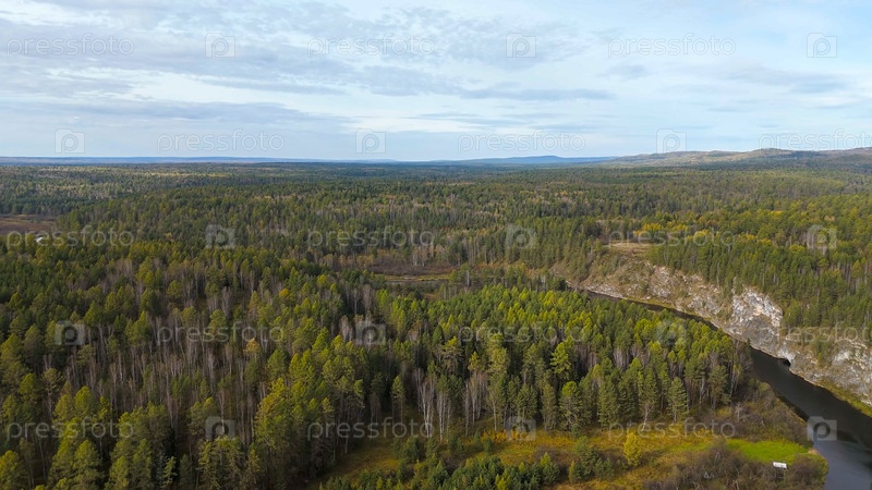 Бажуково, Россия. Осенний ландшафт. Река Серга. Рейндерные ручьи - природный парк в лесистой местности, известный своей богатой флорой, вид с воздуха