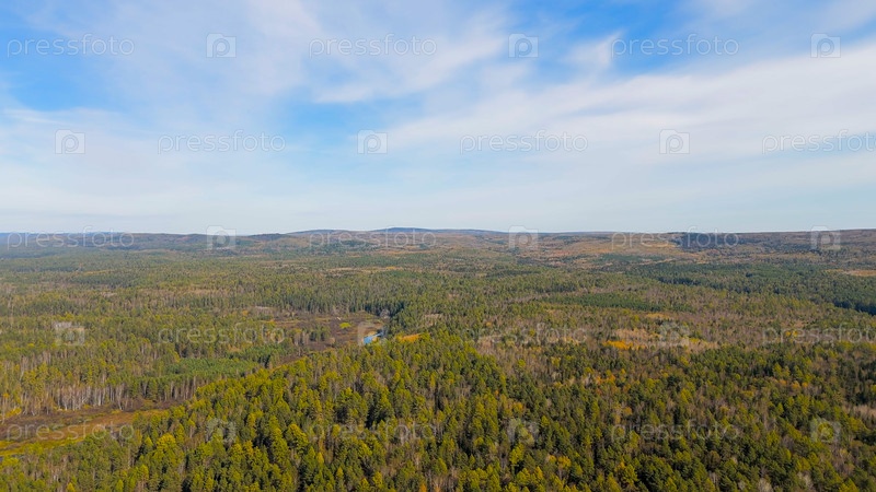 Бажуково, Россия. Осенний ландшафт. Река Серга. Оленьи ручьи. Природный парк в лесистой местности, известной богатой флорой, вид с воздуха