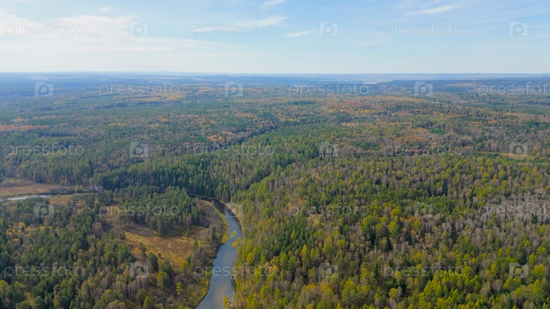 Бажуково, Россия. Осенний ландшафт. Река Серга. Рейндерные ручьи - природный парк в лесистой местности, известный своей богатой флорой, вид с воздуха