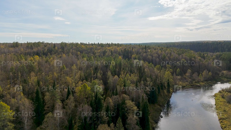 Бажуково, Россия. Осенний ландшафт. Река Серга. Рейндерные ручьи - природный парк в лесистой местности, известный своей богатой флорой, вид с воздуха