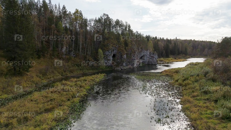 Бажуково, Россия. Осенний ландшафт. Река Серга. Рейндерные ручьи - природный парк в лесистой местности, известный своей богатой флорой, вид с воздуха