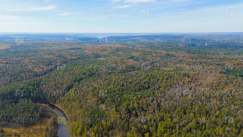 Бажуково, Россия. Осенний ландшафт. Река Серга. Рейндерные ручьи - природный парк в лесистой местности, известный своей богатой флорой, вид с воздуха