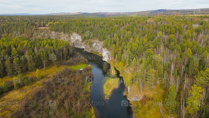 Бажуково, Россия. Скала Писаника. Наскальные рисунки сделаны более 3000 лет назад. Падение. Река Серга. Оленьи ручьи - природный парк в лесистой местности, Aerial View