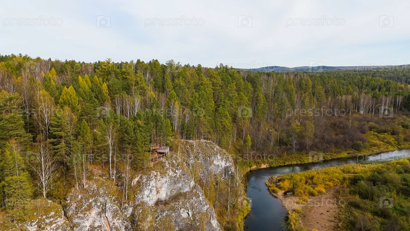 Бажуково, Россия. Светлая скала. Осенний пейзаж. Река Серга. Рейндерные ручьи - природный парк в лесистой местности, известный своей богатой флорой, вид с воздуха