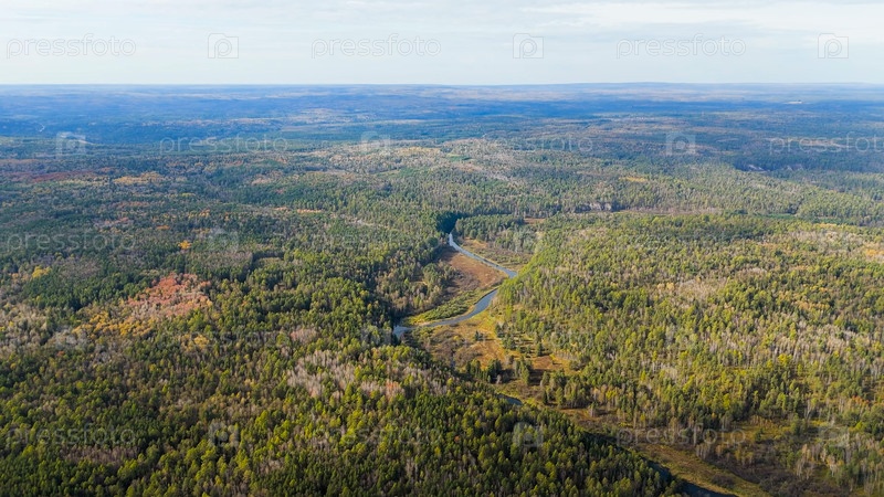 Бажуково, Россия. Осенний ландшафт. Река Серга. Рейндерные ручьи - природный парк в лесистой местности, известный своей богатой флорой, вид с воздуха