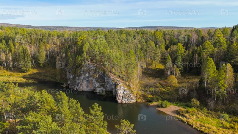 Бажуково, Россия. Фрогстоун. Осенний пейзаж. Река Серга. Рейндерные ручьи - природный парк в лесистой местности, известный своей богатой флорой, вид с воздуха