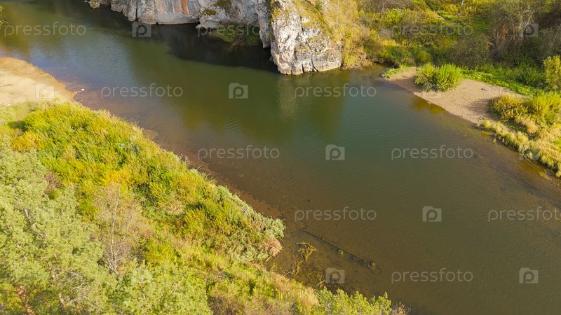 Бажуково, Россия. Фрогстоун. Осенний пейзаж. Река Серга. Рейндерные ручьи - природный парк в лесистой местности, известный своей богатой флорой, вид с воздуха