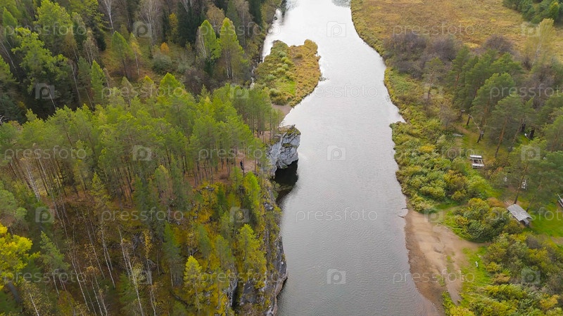 Бажуково, Россия. Фрогстоун. Осенний пейзаж. Река Серга. Рейндерные ручьи - природный парк в лесистой местности, известный своей богатой флорой, вид с воздуха