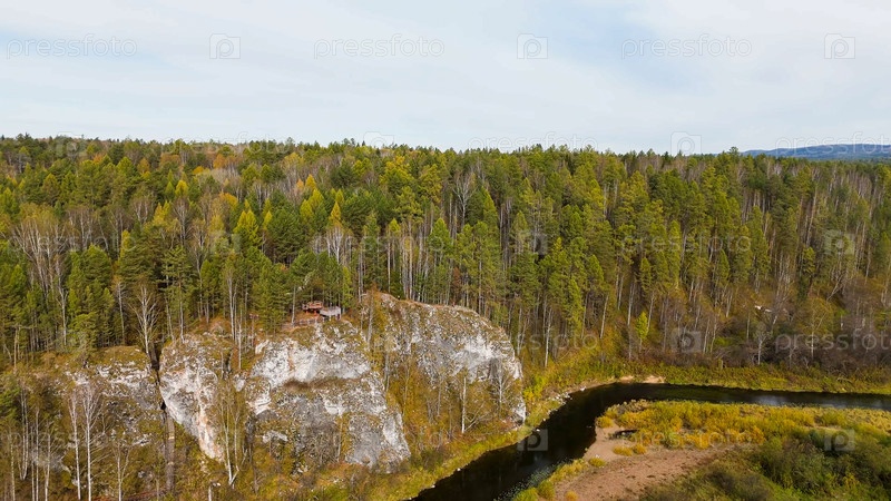Бажуково, Россия. Светлая скала. Осенний пейзаж. Река Серга. Рейндерные ручьи - природный парк в лесистой местности, известный своей богатой флорой, вид с воздуха