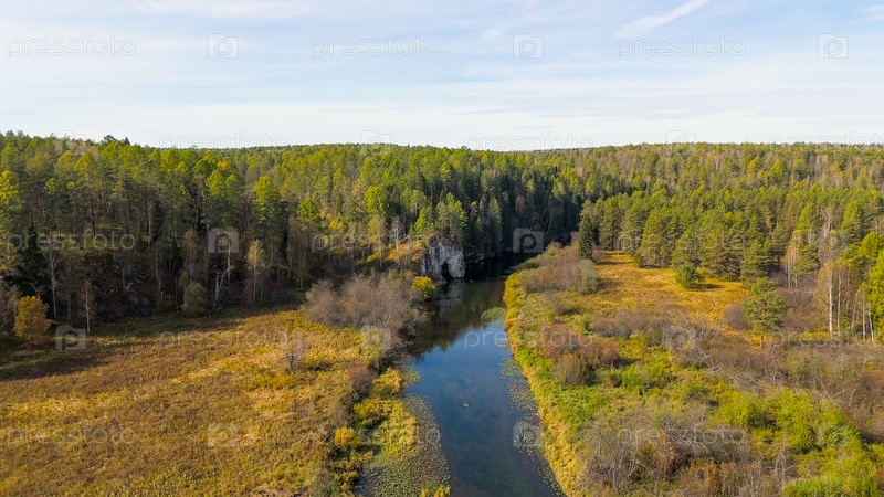 Бажуково, Россия. Каменная дыра или пьяный конь. Осенний пейзаж. Река Серга. Оленьи ручьи. Природный парк в лесистой местности, известной богатой флорой, вид с воздуха