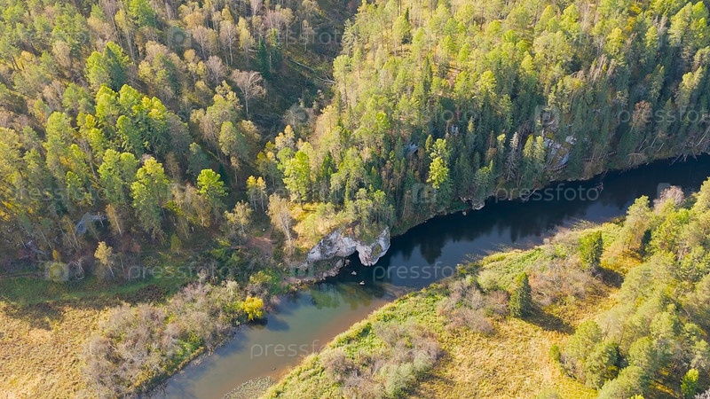 Бажуково, Россия. Каменная дыра или пьяный конь. Осенний пейзаж. Река Серга. Оленьи ручьи. Природный парк в лесистой местности, известной богатой флорой, вид с воздуха
