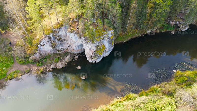 Бажуково, Россия. Каменная дыра или пьяный конь. Осенний пейзаж. Река Серга. Оленьи ручьи. Природный парк в лесистой местности, известной богатой флорой, вид с воздуха