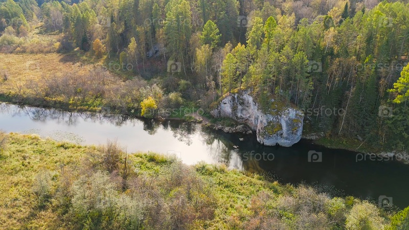 Бажуково, Россия. Каменная дыра или пьяный конь. Осенний пейзаж. Река Серга. Оленьи ручьи. Природный парк в лесистой местности, известной богатой флорой, вид с воздуха