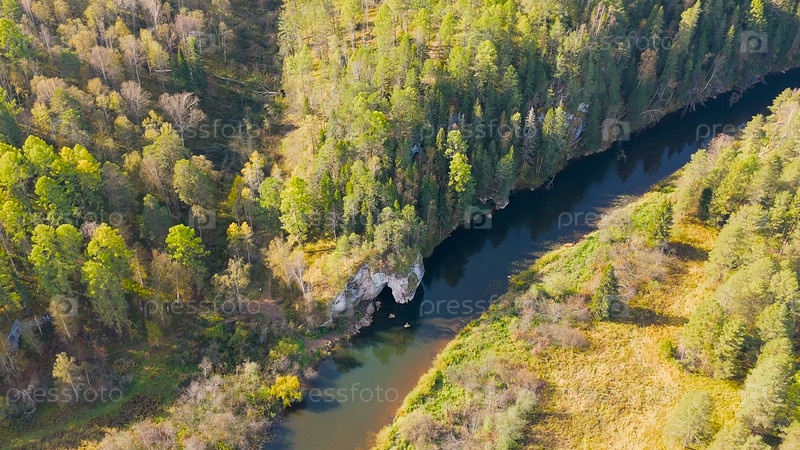 Бажуково, Россия. Каменная дыра или пьяный конь. Осенний пейзаж. Река Серга. Оленьи ручьи. Природный парк в лесистой местности, известной богатой флорой, вид с воздуха