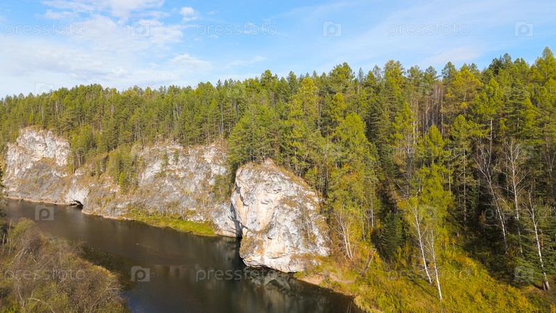 Бажуково, Россия. Скала Писаника. Наскальные рисунки сделаны более 3000 лет назад. Падение. Река Серга. Оленьи ручьи - природный парк в лесистой местности, Aerial View