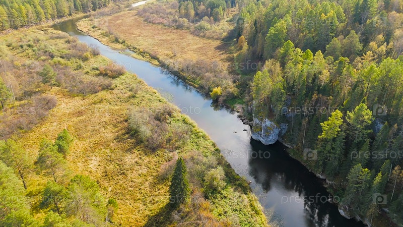 Бажуково, Россия. Каменная дыра или пьяный конь. Осенний пейзаж. Река Серга. Оленьи ручьи. Природный парк в лесистой местности, известной богатой флорой, вид с воздуха
