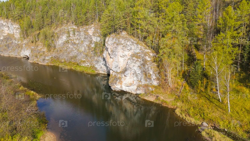 Бажуково, Россия. Скала Писаника. Наскальные рисунки сделаны более 3000 лет назад. Падение. Река Серга. Оленьи ручьи - природный парк в лесистой местности, Aerial View