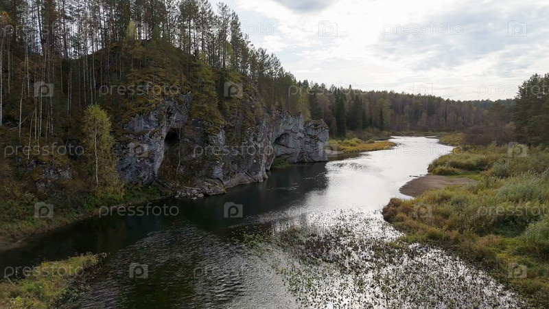 Бажуково, Россия. Осенний ландшафт. Река Серга. Рейндерные ручьи - природный парк в лесистой местности, известный своей богатой флорой, вид с воздуха