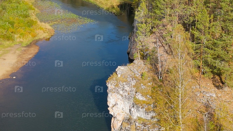 Бажуково, Россия. Фрогстоун. Осенний пейзаж. Река Серга. Рейндерные ручьи - природный парк в лесистой местности, известный своей богатой флорой, вид с воздуха