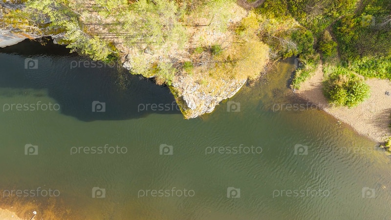 Бажуково, Россия. Фрогстоун. Осенний пейзаж. Река Серга. Рейндерные ручьи - природный парк в лесистой местности, известный своей богатой флорой, вид с воздуха