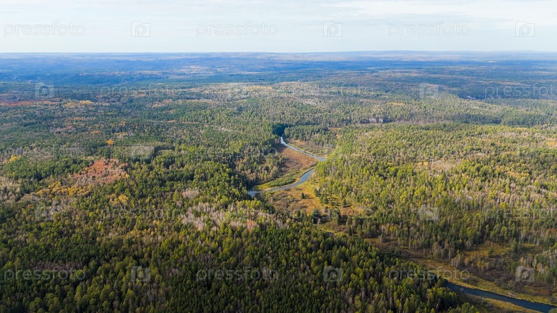 Бажуково, Россия. Осенний ландшафт. Река Серга. Рейндерные ручьи - природный парк в лесистой местности, известный своей богатой флорой, вид с воздуха