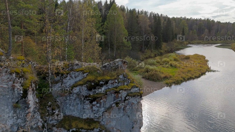 Бажуково, Россия. Фрогстоун. Осенний пейзаж. Река Серга. Рейндерные ручьи - природный парк в лесистой местности, известный своей богатой флорой, вид с воздуха