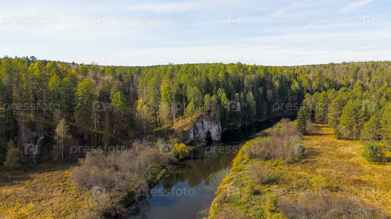 Бажуково, Россия. Каменная дыра или пьяный конь. Осенний пейзаж. Река Серга. Оленьи ручьи. Природный парк в лесистой местности, известной богатой флорой, вид с воздуха