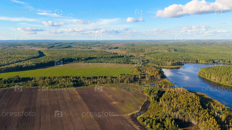 Екатеринбург, Россия. болотистое озеро и оробленное поле. Уборка урожая. Очистка картофеля. Вечернее время, ранняя осень, Aerial View