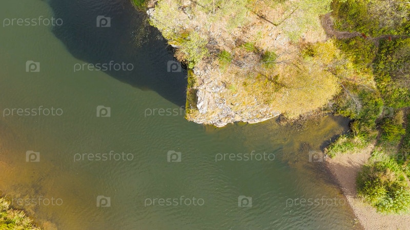 Бажуково, Россия. Фрогстоун. Осенний пейзаж. Река Серга. Рейндерные ручьи - природный парк в лесистой местности, известный своей богатой флорой, вид с воздуха