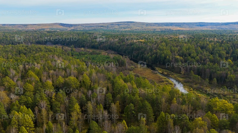 Бажуково, Россия. Осенний ландшафт. Река Серга. Рейндерные ручьи - природный парк в лесистой местности, известный своей богатой флорой, вид с воздуха