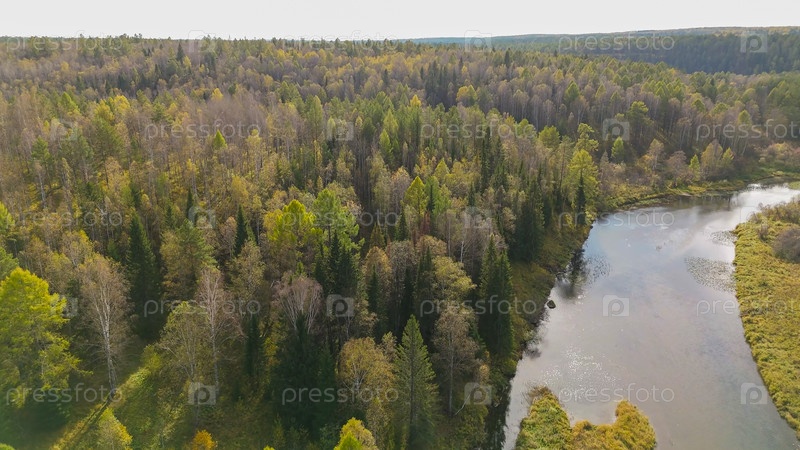 Бажуково, Россия. Осенний ландшафт. Река Серга. Рейндерные ручьи - природный парк в лесистой местности, известный своей богатой флорой, вид с воздуха