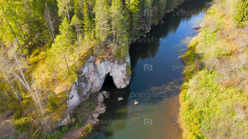 Бажуково, Россия. Каменная дыра или пьяный конь. Осенний пейзаж. Река Серга. Оленьи ручьи. Природный парк в лесистой местности, известной богатой флорой, вид с воздуха